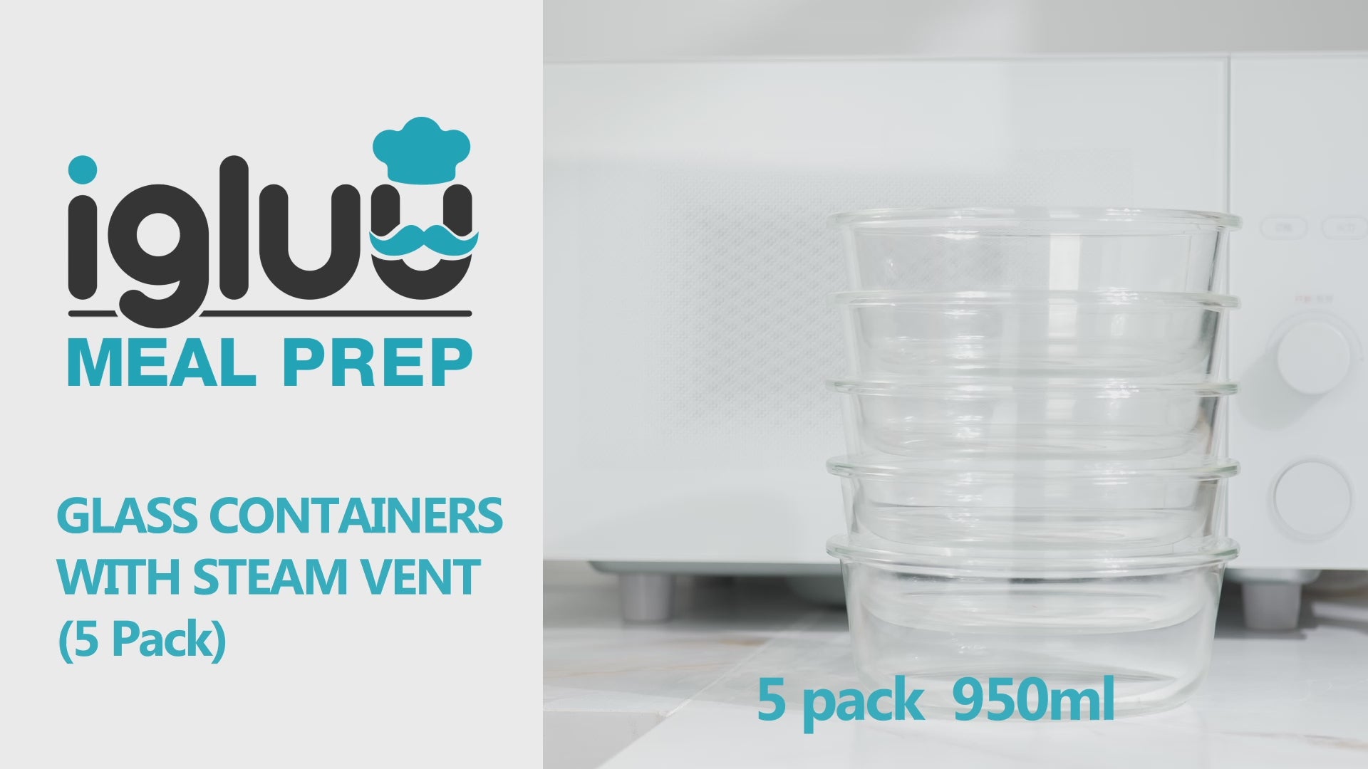 Round Glass Containers with Steam Vent Lid - 950ml - 5 PACK + 1 extra lid